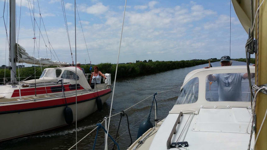 Ihr könnt kommen, Bier ist kalt“ schallte es durch den Äther Koggeplaet war jetzt unser Zielhafen, bei Ilse und Horst. Bier macht‘s möglich! Dass Segler immer einen Anlegeschluck brauchen, ist historisch belegt und schon verankert, "wegen Klabautermann Wassergötter, Rasmus und Ramses" oder wie die alle heißen! Heute aber ist Poseidon für uns zuständig. Der war für die Binnengewässer eingeteilt. Oder sein Kumpel der Neptun. Der Skipper der Mira erwartete uns schon an der Hafeneinfahrt. Den Liegeplatz für die Nacht hatte Horst schon organisiert. „Naja es blieb im Rahmen, beim Bier, nur Schluckweise, wir wollten ja am nächsten Tag das Ziel Texel angehen“. Ich glaube im Nachhinein sagen zu können, wir waren bis dahin allein unterwegs gewesen. Ein satter „fünfer“ stand immer noch an. Und die Pupillen sollten morgen ja den Durchblick haben. „Glasklar“. 13. Juli. 2017 - Nach dem Frühstück geht es mit beiden Booten übers Fluessener Meer, bei moderatem Wind aus Südost. „Unter Vollzeug , auf die Reise nach Texel“. "Horst durfte, wir waren schon unterwegs, noch eine Bastelstunde einlegen. „ Er hatte vergessen, die schön sauber gewaschene Großschot zu belegen“. Da musste natürlich sein Motor erst einmal aushelfen. Es war aber kein lang andauerndes Handicap. So ging es mit ca. 4, 5 Knoten dem Etappenziel Stavoren entgegen. Heute waren im gegensatz zu Gestern sehr viele Boote unterwegs. „Wollen die alle nach Texel, fragte Bärbel“. - Haven voll,