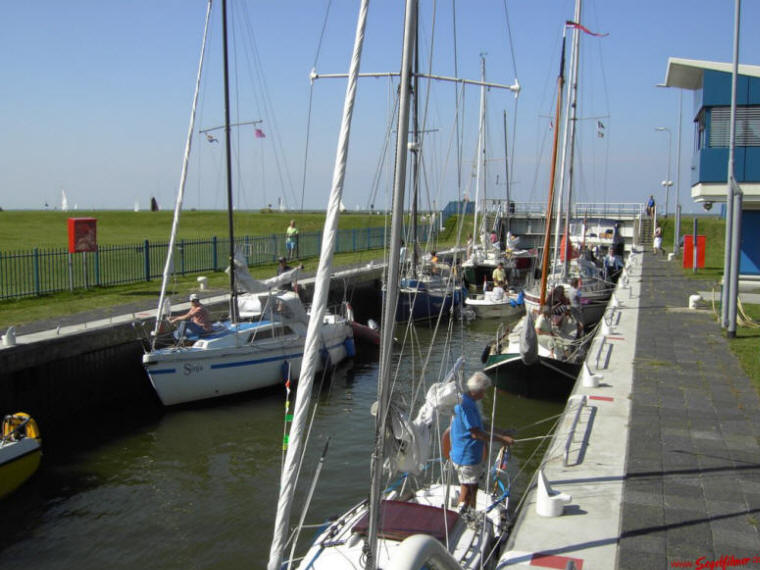 Ausblick von der gesamten Schleusenanlage. Um 17 Uhr - 1,5 Stunden vor Niedrigwasser lösten wir die Festmacher bei immer noch schlappen Wind. Unser Motor wird uns in den nächsten 2 Stunden durchs Wattenmeer schieben müssen. Wir müssen schon wachsam sein um im Fahrwasser zu bleiben. Besonders hier im Visjagersgaatje ist erhöhte Aufmerksamkeit angebracht.