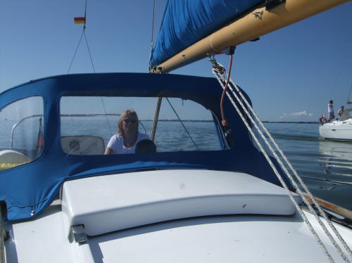 Die Sonne und auch der Wind waren auf unsere Seite. Begeistert über diesen Zustand rauschen wir dem neuen Ziel entgegen. Locker zeigte unser GPS über 5 Knoten an. So macht Segeln spaß. Müsste immer so sein sagte Bärbel. - War aber nicht. Er macht gerade sein Mittagschläfchen, der pennt, dem geht die Puste aus, ey, mach ich was falsch, der kann uns doch nicht einfach hier stehen lassen, brach es aus mir heraus, als die Segel nur noch locker schlabberten. Die Anderen dümpeln auch tröstete mich mein Bordmäuschen. Wir wollten doch Benzin sparen. Der Jockel half uns diese Flaute zu überwinden. Ca. ein Stündchen ratterte der Motor. Erst ganz zart, dann immer kräftiger blasend meldete sich unser Kumpel zurück. Das IJsselmeer schreibt seine eigenen Gesetze. Der Bursche pustete immer kräftiger und mit seiner Hilfe wurden die Wellen, „typisch für Enkhuizen“ immer höher. Es ist ein fetter Vierer „du kannst mich nicht mehr einen Dreier einreden, „so langsam weiß auch ich was hier abgeht, äußerte sich Bärbel“. Sie mag keine Motorboote und keine hohen Wellen „besonders nicht die von Enkhuizen“. Unterstrich gleichzeitig, dass ihr diese Schaukelei nichts mehr ausmacht. Wir freuten uns auf den Anlege- schluck. „Heute mal im Compagnieshaven“. Die Wege sind dann nicht mehr ganz so weit und Brötchen gibt es direkt vor der Haustür. Am folgenden Morgen tuckerten wir über einen fetten Algenteppich nach Stavoren. Kein Lüftchen regte sich. Segeln geht anders. Vielleicht klappt es ja am nächsten Tag zurück nach Lemmer. Bleiben wir doch hier und warten auf den Wind, war beschlossene Sache. Die Flaute hatte Bestand. Mehr als einen ganzen Tag an der Insel in Stavoren wird auch für uns zu eintönig.