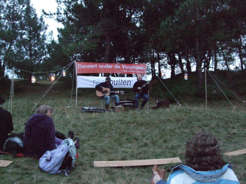 „Geht ihr heute Abend mit zum Leuchtturm": fragte Udo. Dort findet ein Auftritt des bekannten Folkduo Drijfhout statt, „es ist sicher sehr interessant für euch". Etwas nett angezogen machten wir uns gegen halb acht auf den Weg. Udo, der die Insel schon sehr gut kannte, führte uns auf verschlungenen Pfaden zum Festplatz. - Quer durch das angrenzende Wäldchen, „man spürt hier den Wind nicht“, suchten wir die „Naturbühne“.