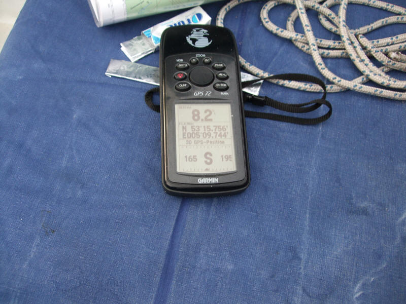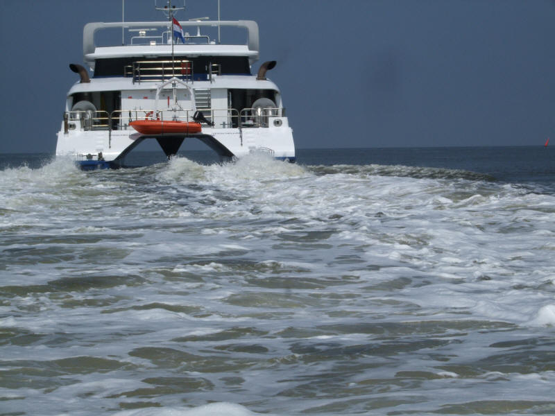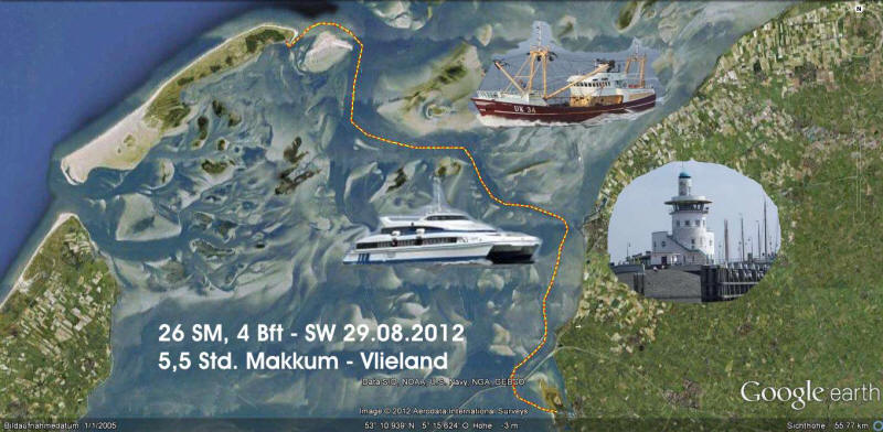Die von diesen Booten ausgehenden Wellen sind harmlos. Happige Wasserwalzen werden meist von den kleineren schnell fahrenden Schiffen verursacht. Die höchsten Wellen kommen von den Fischkuttern, - auch die von dem Schnelltaxi aus Vlieland verursachten Wellen sind nicht ohne. Obwohl für die Sportschifffahrt der Weg mit gelben Tonnen ausgewiesen ist, blubbern die Wellen ungebremst zu uns herüber. Bei sechs Meter sechzig schaukelt es schon mal etwas mehr. Manchmal hatten wir das Gefühl, unsere Stella wollte abheben. Der Wind pustete weiterhin seinen Vierer übers Geschehen. Halt die Kamera mal aufs Navi, das glaubt uns kein Mensch. Mit 8,2 Knoten, „na klar über Grund“, rauschen wir unserer Insel entgegen.