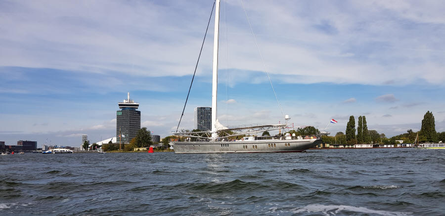 Draußen auf dem Markermeer folgte eine Überraschung die wir nicht auf dem Schirm hatten. Zwangläufig erst einmal Kurs Hoorn. Die Berufsschiffer machten es uns vor. Die Küstenbereiche bis weit hinter Almere waren gesperrt. Hier wühlten riesige saugende Sandbagger das Markermeer auf die benötigte Tiefe. Es war kein kleiner Umweg für uns. Von Amsterdam war erst einmal gar nichts zu sehen. Immer den Berufsschiffern nach. Irgendwann war Hoek avant IJ, der Leuchtturm auf unserer Steuerbordseite zu sehen und es ging jetzt auf der Buiten IJ immer den Tonnen nach.