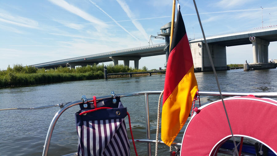 eine Minute Wartezeit. Brücke auf, Brücke zu. Da sind wir